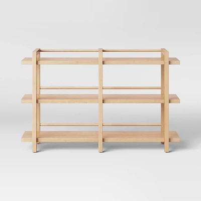 Organize your space and display your books in style with this Hertford Wide Wood Horizontal Bookcase from Threshold™. This wooden bookshelf features an airy design with three open shelves for organizing all your cherished hardbounds, classic novels and contemporary bestsellers, as well as potted plants, collected curios and framed photos. With a light natural finish and modern lines, this three-tier bookshelf instantly elevates your room decor.