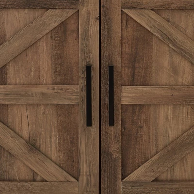 Cabin vibes are just one entertainment console away with Saracina Home’s Atticus Modern Farmhouse 2-Door 48” Corner TV Stand for TVs up to 55”. You may feel like you’re in the countryside, but you can stay plugged in and organized with the help of three cord management ports. A convenient blend of open and closed storage is accentuated by adjustable shelves, primed for displaying consoles and decor. The angled, small-space friendly design easily slides against any corner of your living room, so you can make the most of your unique layout. Rustic barn doors combine with the geometric silhouette and raised metal base for a piece that feels right at home in both farmhouse and modern settings. Overall Product Dimensions:Height: 32”Width: 47.625”Depth: 15.75”Center Cubby Dimensions:Height: 6.125”Width: 30.75”Depth: 14.875”Top Side Shelves Dimensions:Height: 6.125”Width: 10.375”Depth: 14.625” – 10.375”Middle and Bottom Side Shelves Dimensions:Height: 9.25”Width: 10.375”Depth: 14.625” – 10.375”Cabinet Dimensions:Height: 19”Width: 14.75”Depth: 14”Additional Dimensions:Leg Height: 5”Tabletop Thickness: 0.625”